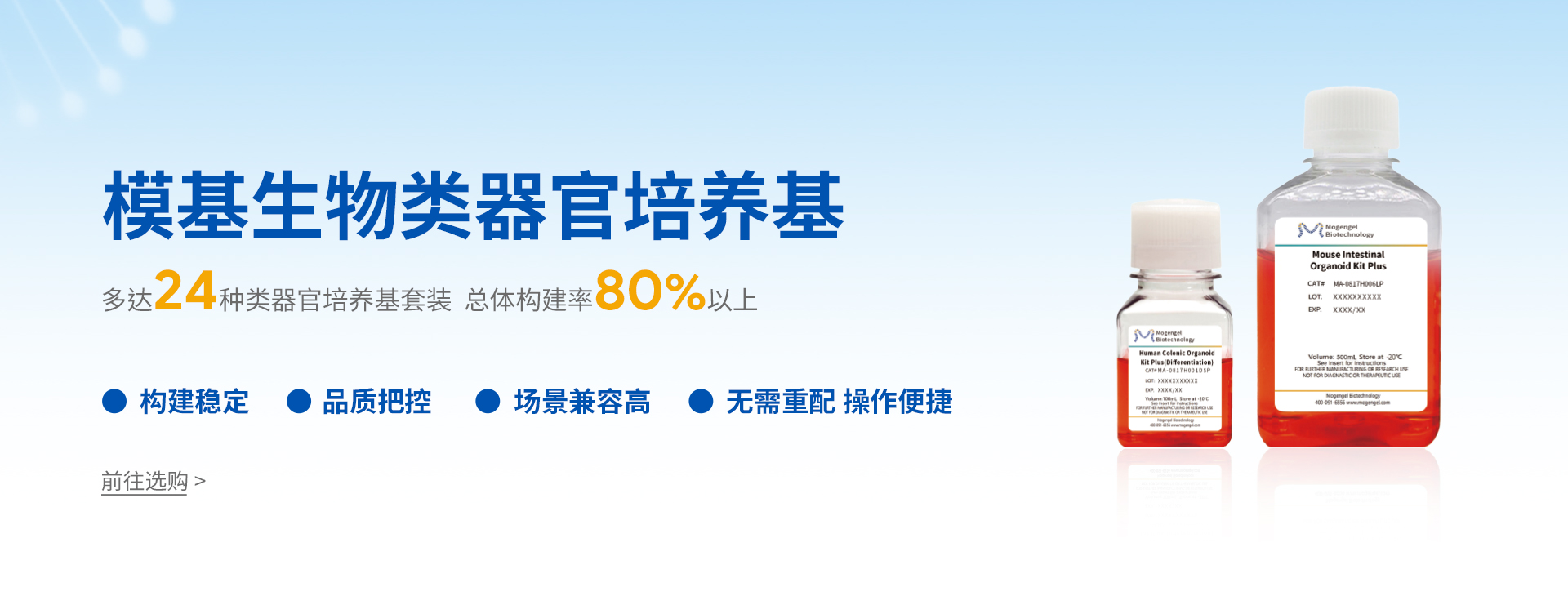 廈門模基生物科技有限公司致力于3D細(xì)胞培養(yǎng)核心原材料的研發(fā)與產(chǎn)業(yè)化升級,是國內(nèi)一家從科研做起,從實(shí)驗(yàn)研究中一路走來的全流程自主研發(fā)、自主生產(chǎn)的企業(yè)。目前公司的產(chǎn)品有基質(zhì)膠、類器官培養(yǎng)基、細(xì)胞因子、3D細(xì)胞培養(yǎng)耗材、3D細(xì)胞培養(yǎng)智能顯微鏡等。公司擁有4大技術(shù)研發(fā)中心:分子克隆和細(xì)胞編輯中心、實(shí)驗(yàn)動(dòng)物中心、蛋白表達(dá)和純化平臺、類器官質(zhì)檢系統(tǒng)和自動(dòng)化。